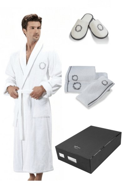 Soft Cotton Luxusní pánský župan SEHZADE s ručníkem a papučkami v dárkovém balení XXL + papučky (42/44) + ručník + box Bílá / stříbrná výšivka. Rozměry…